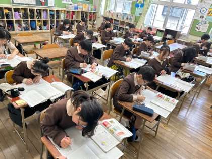 国語「資料を見て考えたことを話そう」では、教科書の資料をもとに自分の考えた内容を書き進めています。