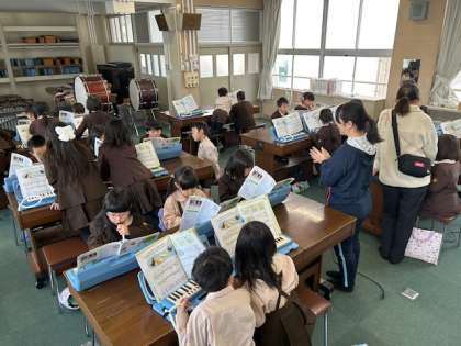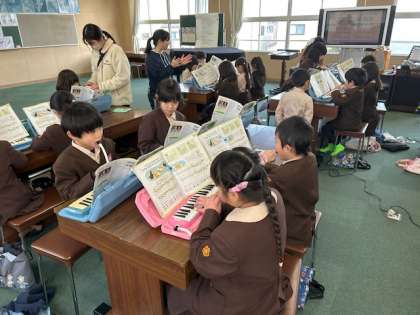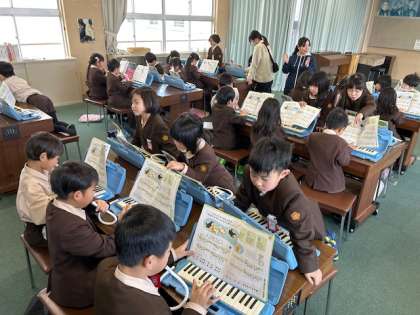 ?音楽「小犬のマーチ」は鍵盤ハーモニカを演奏しています。指遣いが合っているかペアで確かめ合っています。