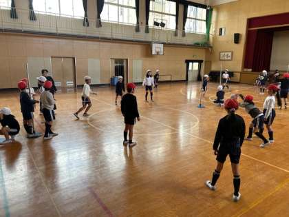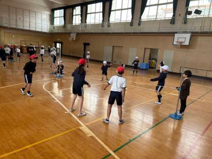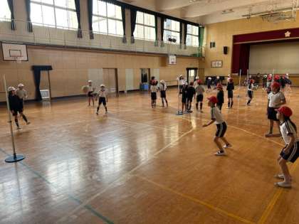 体育「プレルボール」は、バウンドさせたボールを受けるバレーボールに繋がるゲームです。