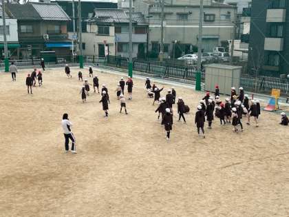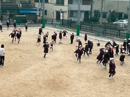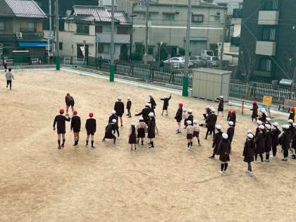 1年生と6年生が全員で「だるまさんがころんだ」をしています。