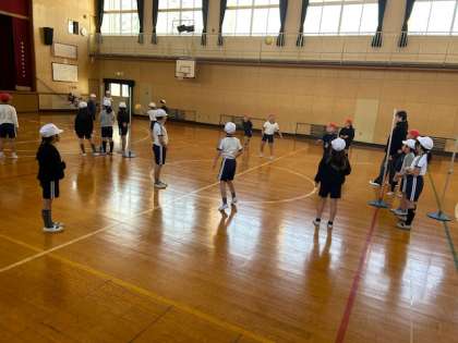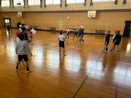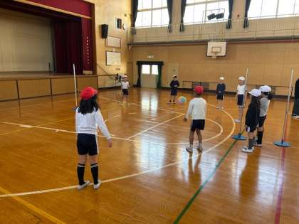 体育「プレルボール」は、班対抗ゲームをしています。審判も自分たちでできるようになり、協力してゲームを楽しんでいます。