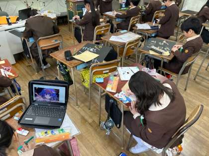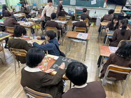 図工「スペシャルメッセージ板」の仕上げをしています。終わったら星を張り重ねて名前を作っています。