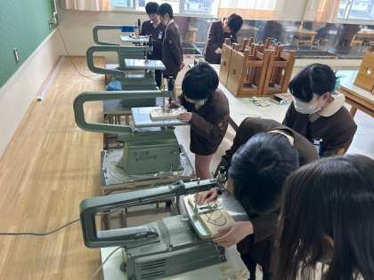 図工「テープカッター」は土台部分を電動糸鋸で切っています。切り終わったら着色に進みます。