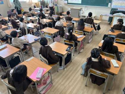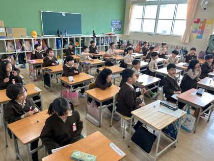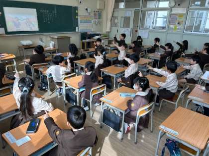 音楽「ドキドキの1年生」は振り付けを加えて元気良く歌いました。