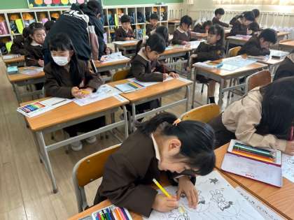 国語「あめふり」はプリントを使って鉛筆で線をなぞったり色鉛筆で色を塗ったりしています。