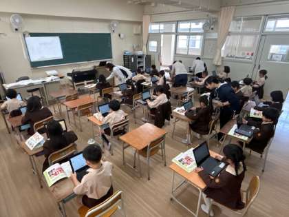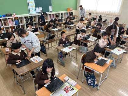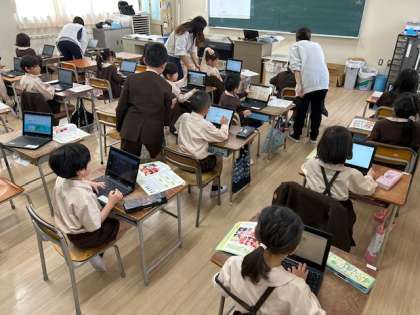 音楽「音楽でみんなとつながろう」では、色んな国の言葉に興味を持ちタブレットで調べました。