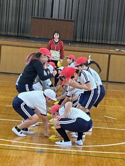 体育「ペアで運動」ではゲーム感覚で俊敏な動きを高めています。