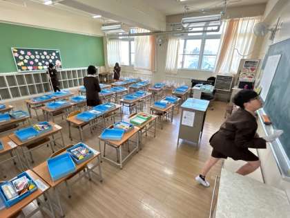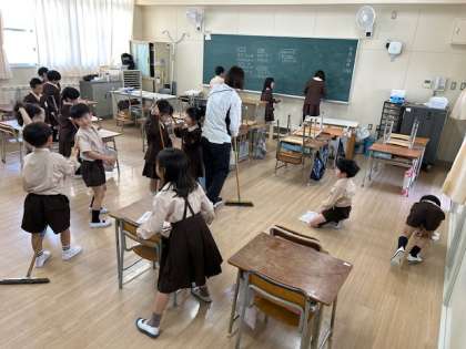 掃除の時間は、それぞれの分担場所に分かれて協力して取り組んでいます。1年生の教室は、暫くの間6年生が綺麗にしてくれています。