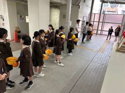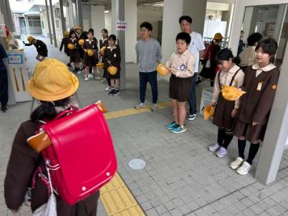 雨の日もピロティで挨拶ボランティアが気持ちの良い挨拶をしています。進んで挨拶できるようにお手本となっています。