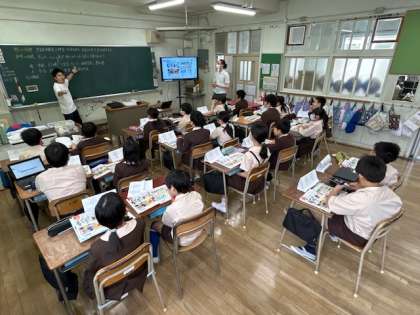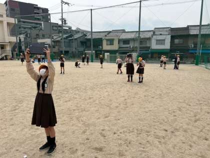 理科「雲の様子と天気」では、方位を確認しながら観測の場所を決め、タブレットに記録をしていきます。