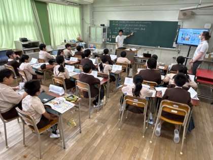 英語「Hello,everyone」では、スライドで見えるものを英語で伝えています。