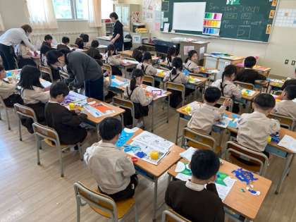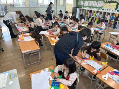 図工「こいのぼり」は、ハサミとのりを上手に使って作品を仕上げていきます。