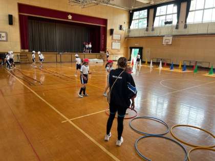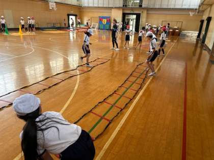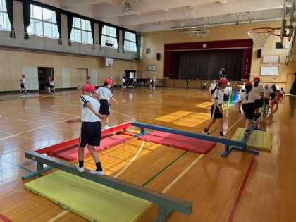 体育「体づくり・体ほぐし」では、平均台やミニハードル、フープやマットを使って俊敏性やバランス感覚を高める運動に取り組んでいます。