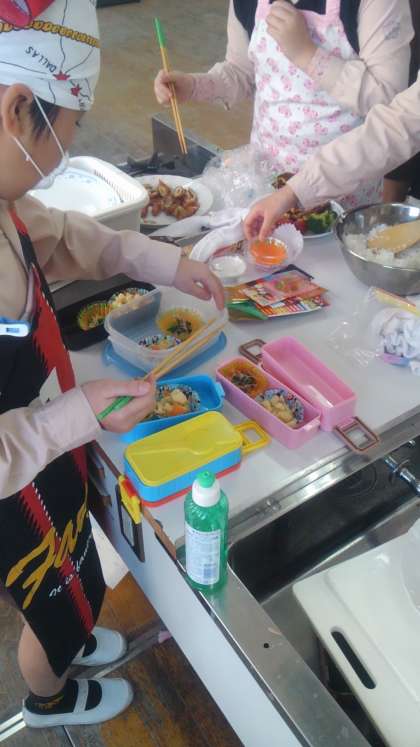 事前に家で担当する料理を練習してきた児童もいて、どの班もとても手際よく、協力しておかずを作りました。さすが5回目の調理実習ともなると、「片付けながら調理」が定着したようでスムーズに進みました。できあがったお弁当はどの班もとってもおいしそう!!2年間の家庭科の学習の成長を感じた実習となりました。