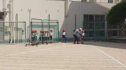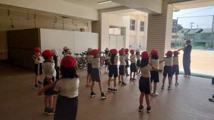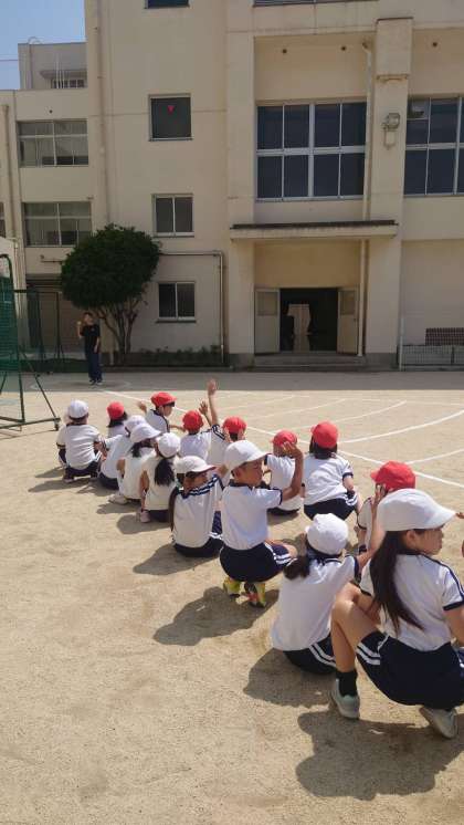 2年生もスポーツテストです。初めてのソフトボール投げ、準備運動では特に肩をしっかり伸ばしました。投げ方、測定方法に加え、安全についても学んだあと、練習をします。記録の測定は気合十分でした。