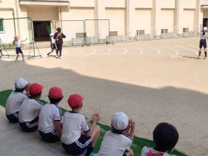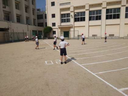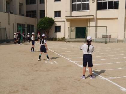 4年生のソフトボール投げは、ボール拾い側と投げる側に分かれて行いました。少しでも遠くまで投げることができるようにと応援にも力が入っていました。