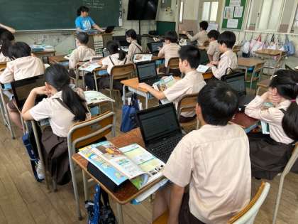 家庭科「整理・整とんで快適に」では、タブレットに記入した考えをみんなで共有しています。