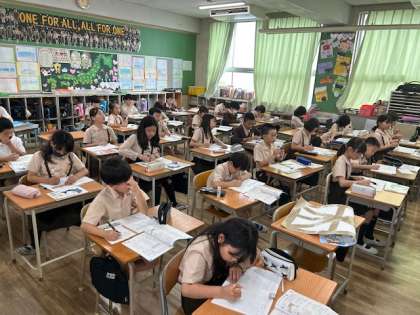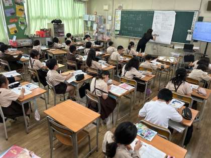 算数「わり算」は、筆算の仕方を学習しています。計算の手順「立てる・かける・引く・おろす」を確かめながら計算しています。