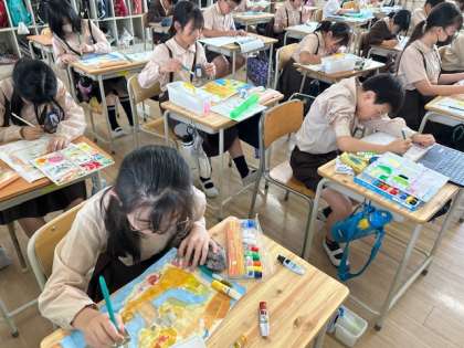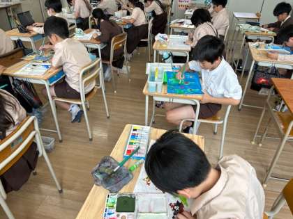 図工「宝の地図」では、出来上がった下描きに色を載せていきます。