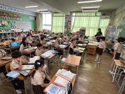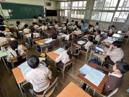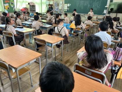学級活動「ドッヂボールのルールを考えよう」では、みんなが楽しめるルールを確かめ合っています。
