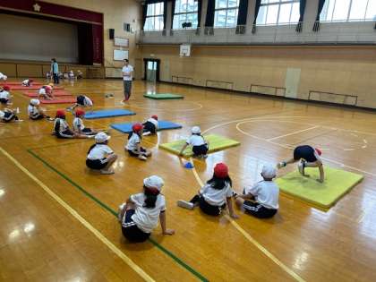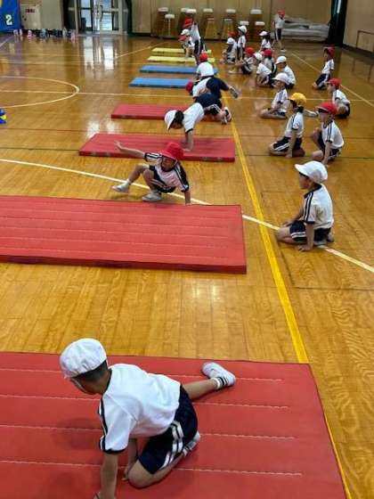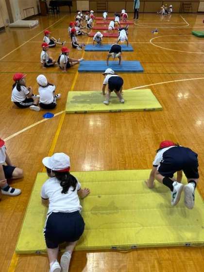 体育「マット遊び」では、カエルやクマ等になって体を支えたり足を高く上げたりして腕支持に慣れていきます。