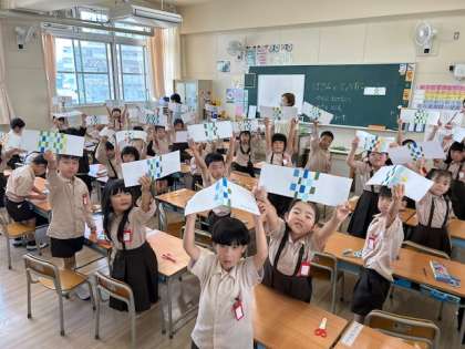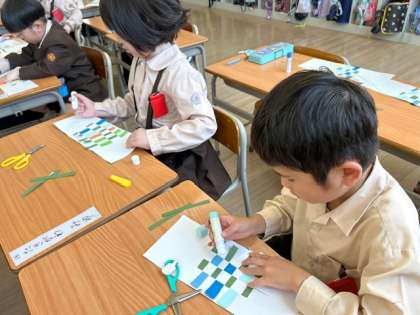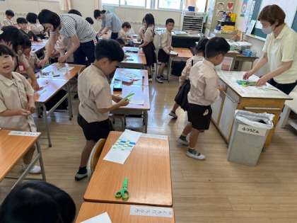 図工「はさみをじょうずに」は、色画用紙を切り、素敵な模様を作りました。
