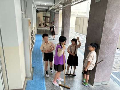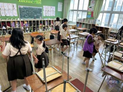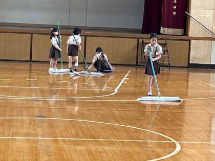 高学年は低学年に分かりやすく優しく掃除の仕方を教えています。
