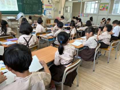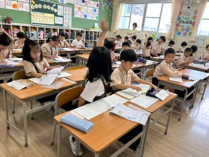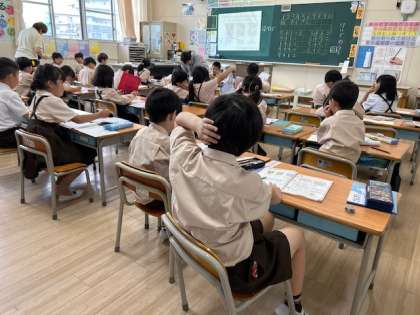 算数「たしざん」では、ノートに式と答えを書いて正しく計算しています。
