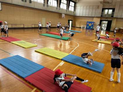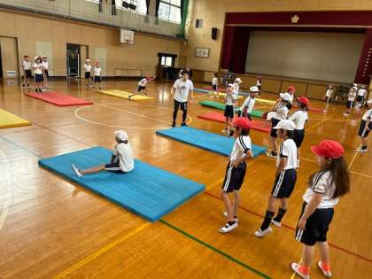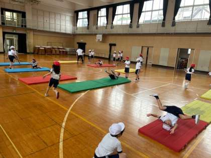 体育「マット運動」では、班に分かれて開脚前転や開脚後転に挑戦しています。