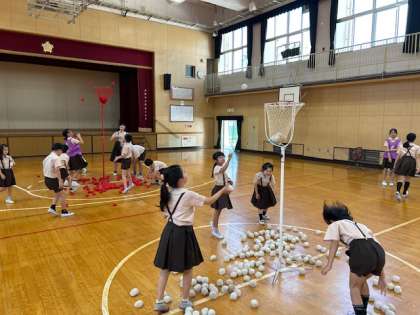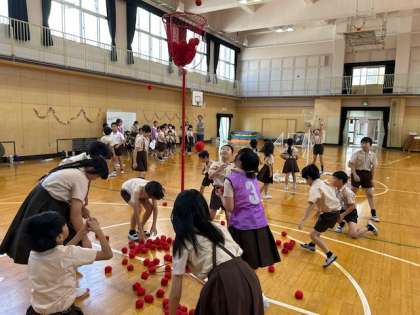 「玉入れ」は、高さをかえた籠にどんどん玉を入れていきます。