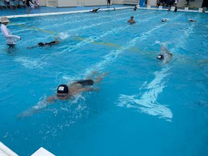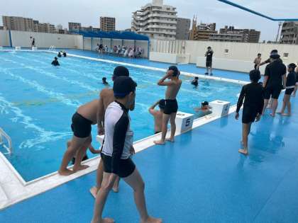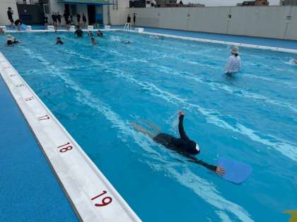 クロールの手のかき方や息継ぎの仕方等を練習しています。