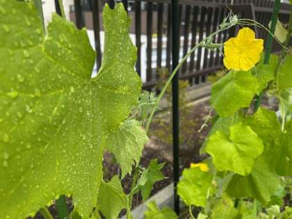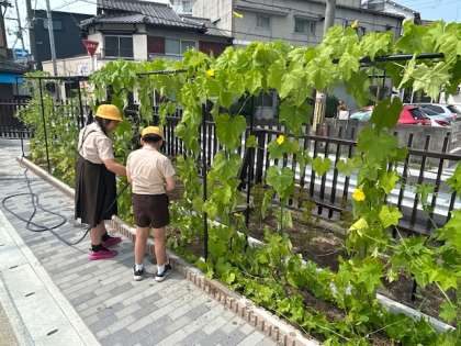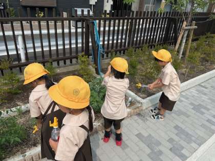 5年生は日直が理科で育てているヘチマの水やりをしています。
