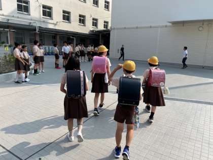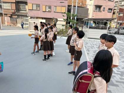 野里イングリッシュ・デーは、Good Morningの爽やかな挨拶で始まります。運動健康委員会は、毎朝、責任を持って役割を果たしています。