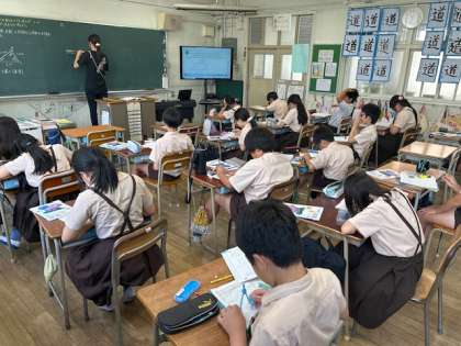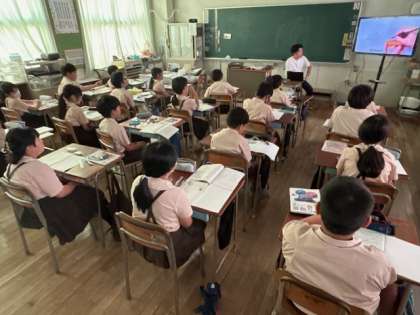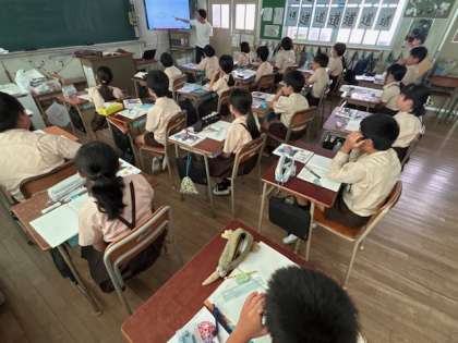 算数「合同な図形」では、分度器やコンパスを使って合同な三角形を描く方法を確かめました。