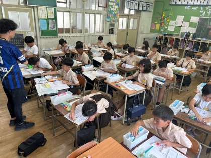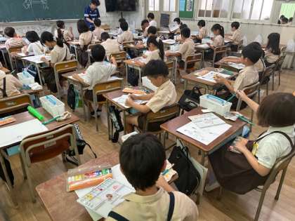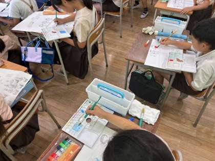図工「心に残った出来事」では、色の組み合わせを考えながら、水彩画の着色を進めていきます。