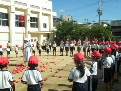 ○ その後、こどもだけで紅白玉を投げ入れる。