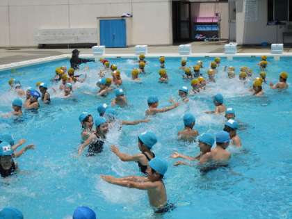 1年生にとっては、小学校での初めてのプール。プールの水の深さに最初戸惑う子もいましたが、入ってしまえば、水の気持ちよさにどの子も笑顔、笑顔。楽しいひとときでした。