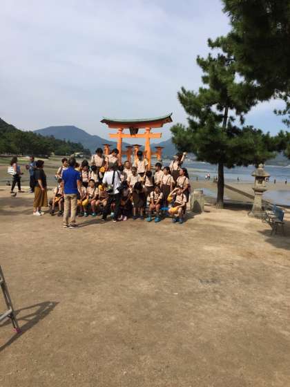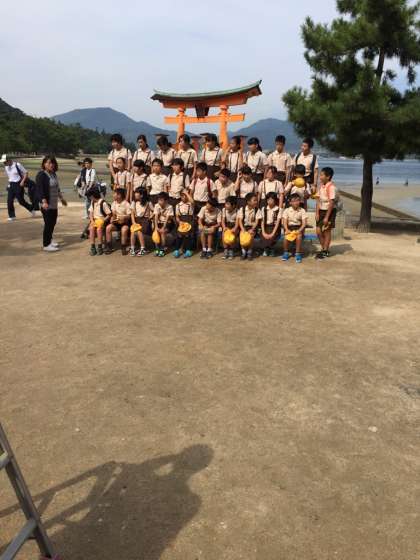 海の中に入る前に鳥居をバックに学級記念撮影をしました。