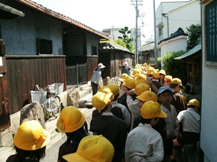 先週の社会科の時間に、学校の屋上から野里の街並みを見渡していたので「この建物は屋上からも見えたね」「野里公園は見えなかったなー」と興味津々でした。他にも野里商店街や住吉神社、野里の渡しなどを見て回り、自分たちの住む町について学習しました。