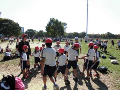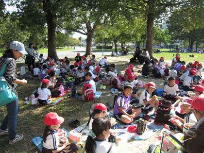 また昼食後も、たてわり班ごとで遊び、大芝生の中、おにごっこや花いちもんめ、だるまさんが転んだなどをして楽しく過ごしました。ここでも高学年の児童が下の学年の子の面倒をしっかりとみて、やさしく接していました。