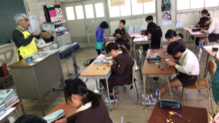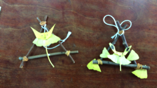 今年はイチョウの葉を使ってキツネを作り、木の枝で作った三角形の枠につけて、すてきな飾りのできあがり!どの児童も、教えて下さるお話を真剣に聞きながら、作業を開始しました。少し苦戦した児童もいましたが、中田さんに教えていただいたり、友だちに教えてもらったりして、全員が自分の作品を作ることができました。