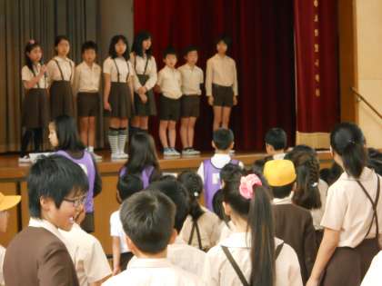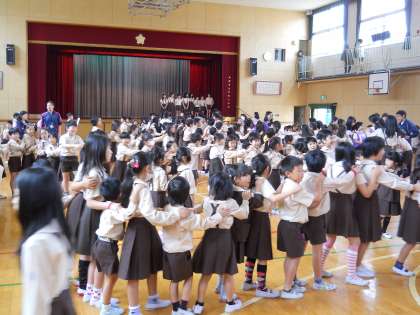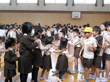 たてわり班が発足し、児童集会が始まりました。初めての児童集会のゲームは「じゃんけん列車」じゃんけんをして勝った人が先頭、負けた人は勝った人の後ろに回って肩をもってつながります。勝ち続けると長い長いじゃんけん列車ができあがります。違う学年の人とじゃんけんをしたり、なかよくつながったり・・ こうして友だちの輪が広がります。