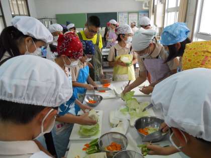 5年生で何度か調理実習の経験もあってか、どのグループも手際よく、また互いに協力しながら作業を行い、見事2種類のおいしそうな野菜いためを完成させました。