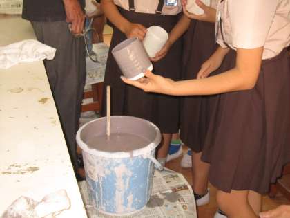 今回の工程は、前回、思い思いに制作したコップに釉薬をかける作業です。素焼きされたコップに一人ずつ釉薬をかけますが、なかなかコツがあるようでどの子も慎重に釉薬をかけていました。