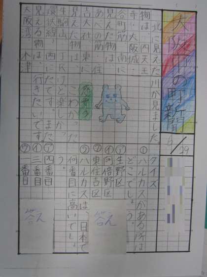 3年生では、先日行った社会見学(環状線一周・あべのハルカスから見た大阪市のようす)のまとめとして、見学でわかったことを一人一人壁新聞を作ってまとめました。出来上がった新聞は教室内の掲示板に掲示していますので、学校にお越しの際はぜひご覧ください。