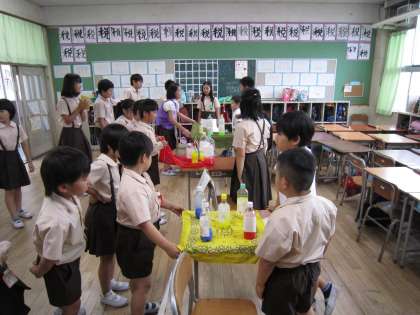 7月5日(木)、児童会行事「サマーフェスティバル」を行いました。前日までのお店の準備から当日のお店の運営、お店めぐりに至るまですべて1年生から6年生で編成するたてわり班で活動しました。
