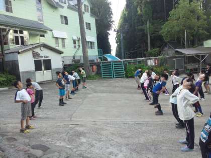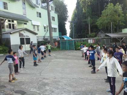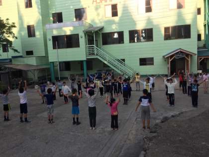 みんな元気です。朝の集いの風景です。ラジオ体操で身体をほぐし、今日の活動に備えます。