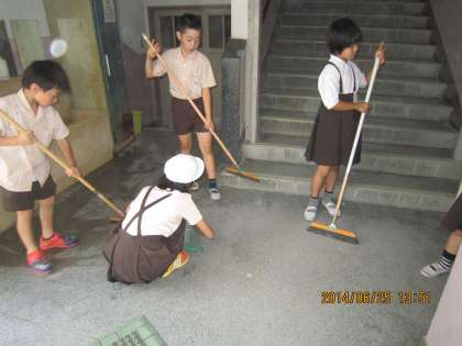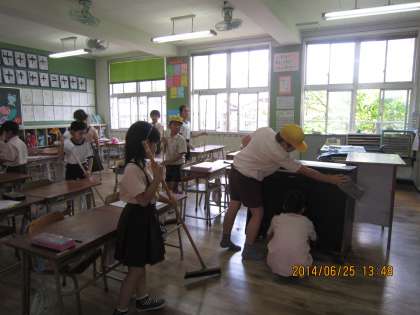 低学年はお兄ちゃんお姉ちゃんに教えてもらいながら、高学年はやさしく教えながら楽しくそうじをしました。最後リーダーのもとにあつまり、反省会をしました。次は2学期に活動する予定です。これを機会に高学年と低学年がより仲よくできるといいですね。