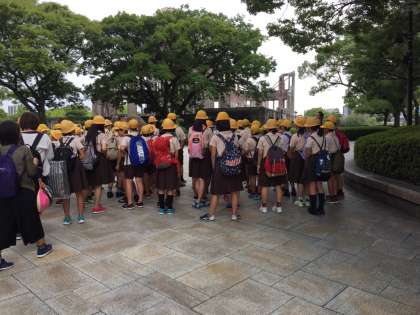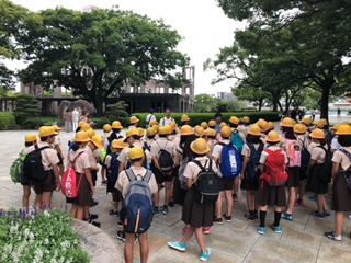 11時1分、原爆ドームの前に到着しました。子ども達は、実際に目の前で見る原爆ドームの様子に驚き、改めて核兵器の恐ろしさを実感していました。