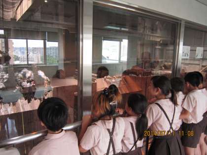 そして、いよいよ工場内の見学です。焼却炉を外から見たり、制御室内のコンピュータを見たり…みんな関心を持って、行儀よく見学していました。その中でも一番みんなが盛り上がったのは「ごみクレーン」だったね!ものすごく大きなクレーンを操作して焼却炉にごみを運ぶ姿に、みんな感動していたよ!!(あまりの深さに足がすくんでいる子も…(*_*))